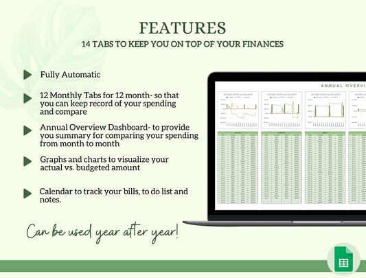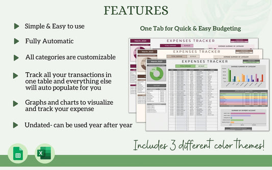 It includes only the things you need and is made to be simple, easy to understand, yet visually appealing. All you have to do is input your transactions and everything else is calculated automatically!